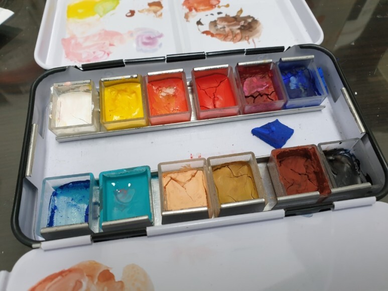 다르게 생각하면 저 두 가지만 해결되면 굳혀 써도 괜찮다는 이야기입니다. 조각나는 것은 어쩔 수 없지만 물감이 팔레트 한 쪽에만 있고 들고 다니지 않는다면 작은 조각이 돌아다닐 일이 없습니다. 보관할 때는 물감 있는 쪽을 아래로 두면 되구요.